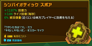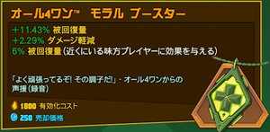 | | ライフ回復(毎秒) | プレイヤーか強敵のアシスト達成から30秒間 | ダメージ軽減(減少) |